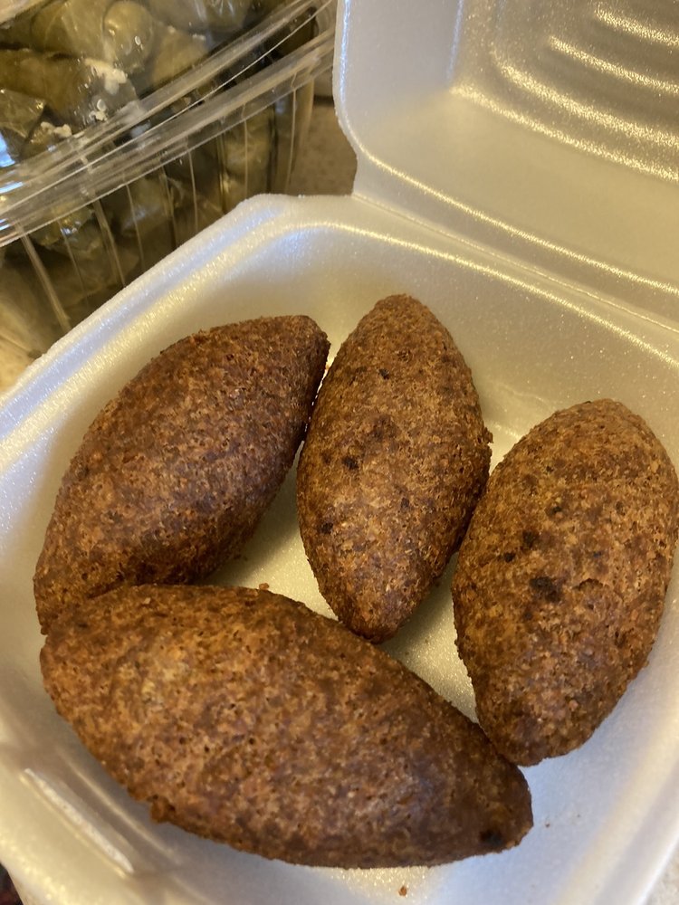 Delicious, Lebanese dish. just a few ingredients: Hummus(chickpeas), Cracked wheat, olive oil & spices.
