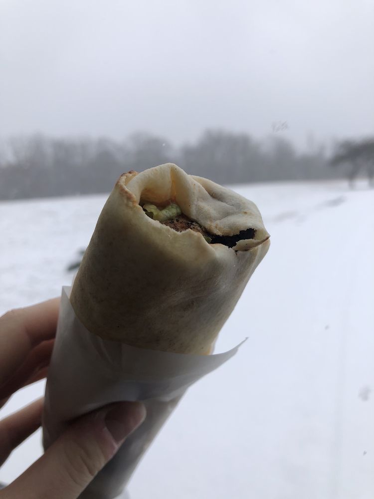 Beef shawarma marinated in a special blend of spices wrapped with pickles, turnips, tomatoes, onions, and tahini sauce