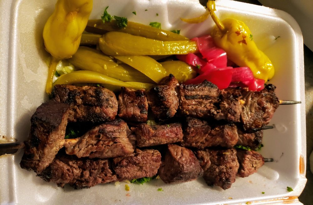 Beef kabob marinated in a special blend of spices wrapped with pickles, turnips, tomatoes, onions, and tahini sauce
